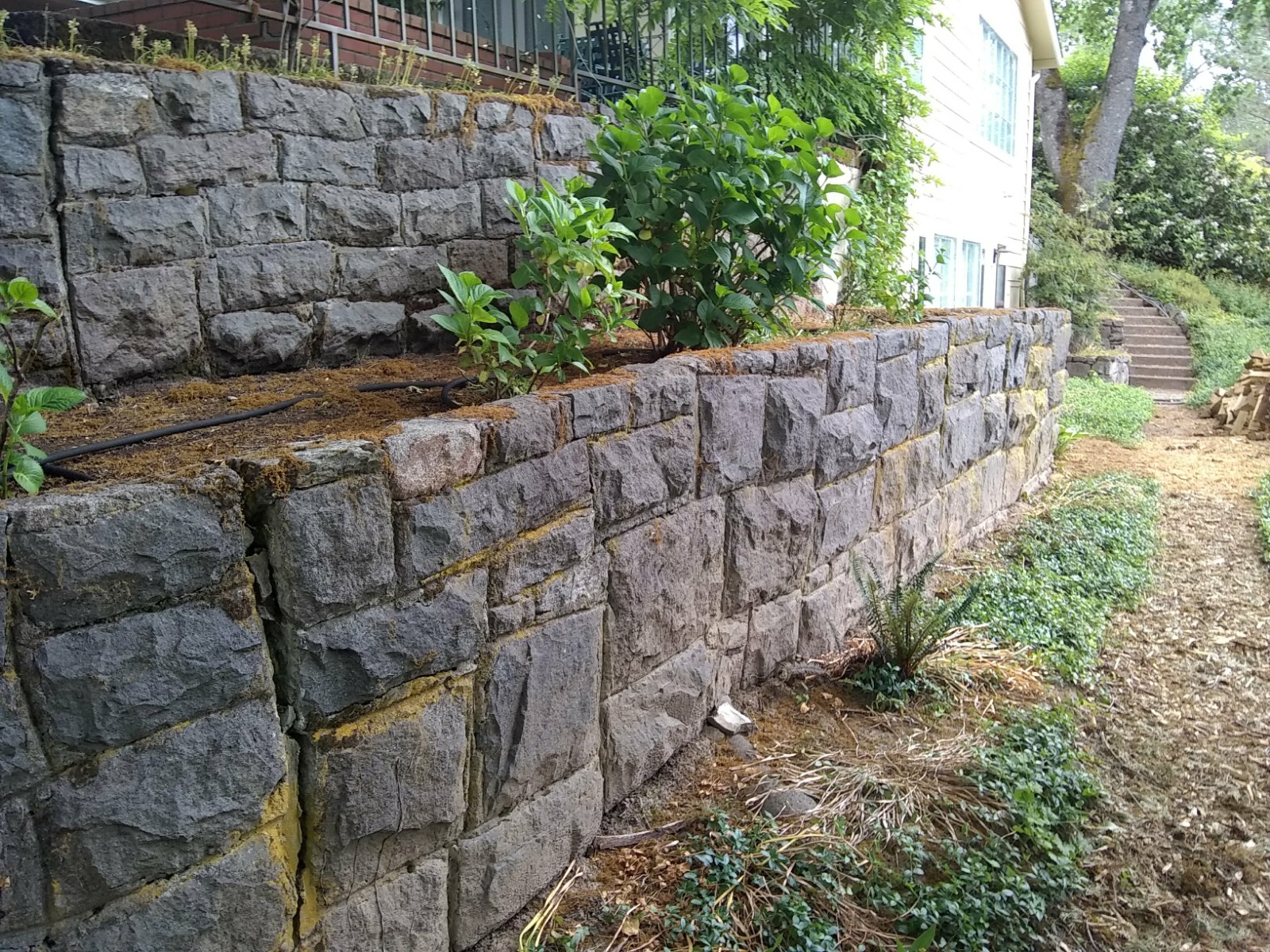 This was a 2 tier dry stack retainer wall we built for a garden area on side of house . we install 2 staircases and then came back and poured a stamp concrete walkway to each staircase and along the wall of the house to keep any water from settling to the foundation.