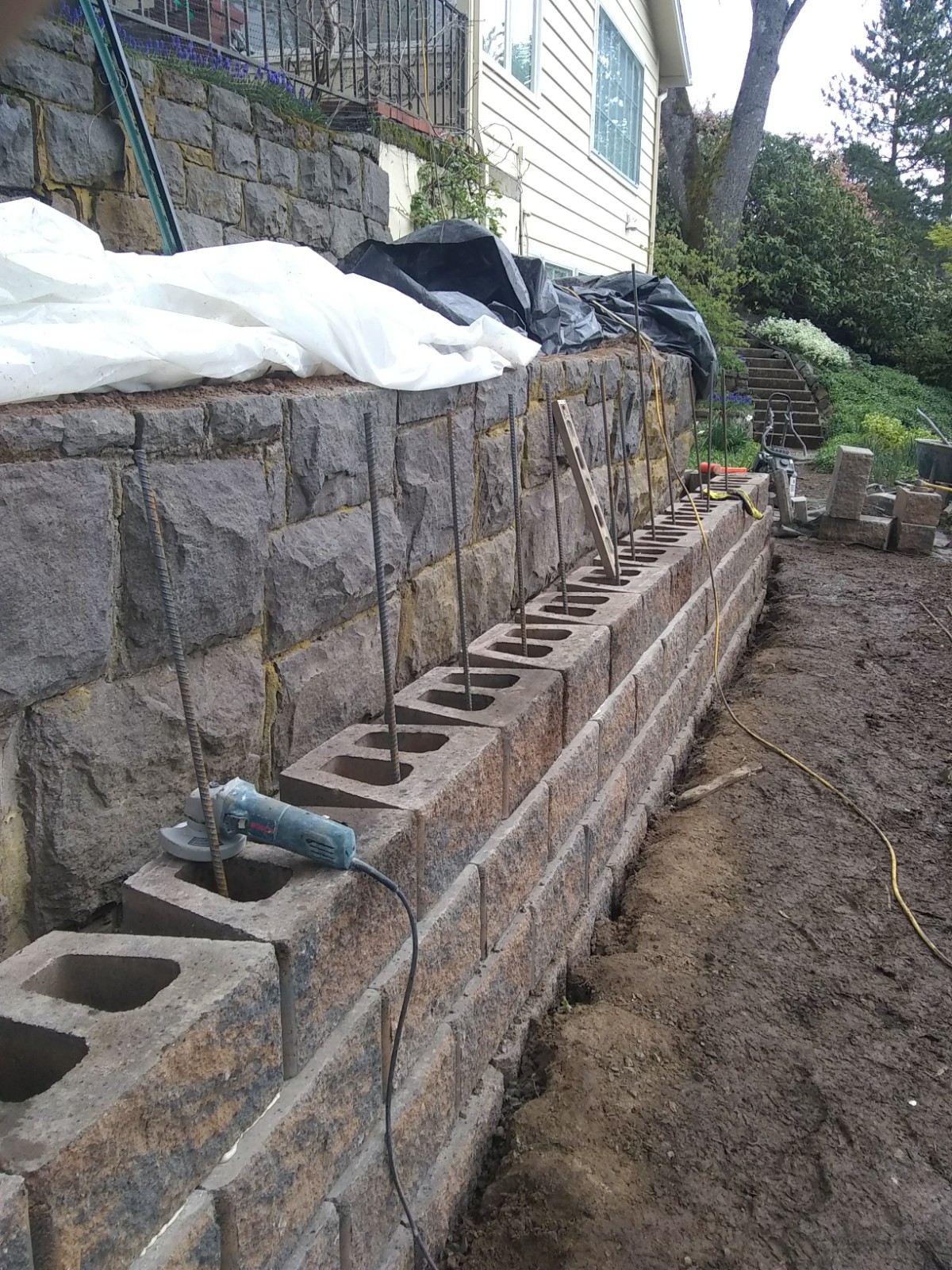 rock wall with rebar in the wall as we built it and a geo matt